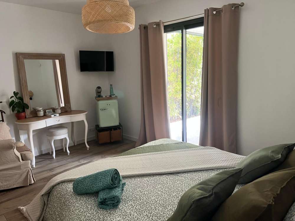 Profitez de l’élégance d’une literie queen-size, d’une salle d’eau privative et d’une climatisation réversible pour un confort en toute saison. Restez connecté grâce au Wi‑Fi et savourez un plateau d’accueil tout en admirant la vue sur la pinède. Pensé avec des équipements haut de gamme, la suite allie charme et confort.